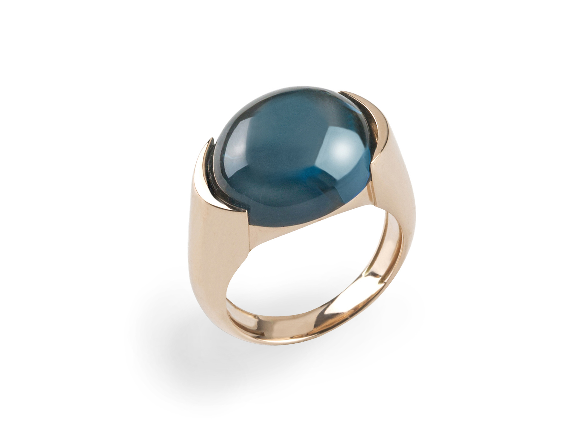 Ring in pink gold with central London blue Topaz cabochon from Hausmann & Co. Cinque Terre Collection. Hand made in Italy.