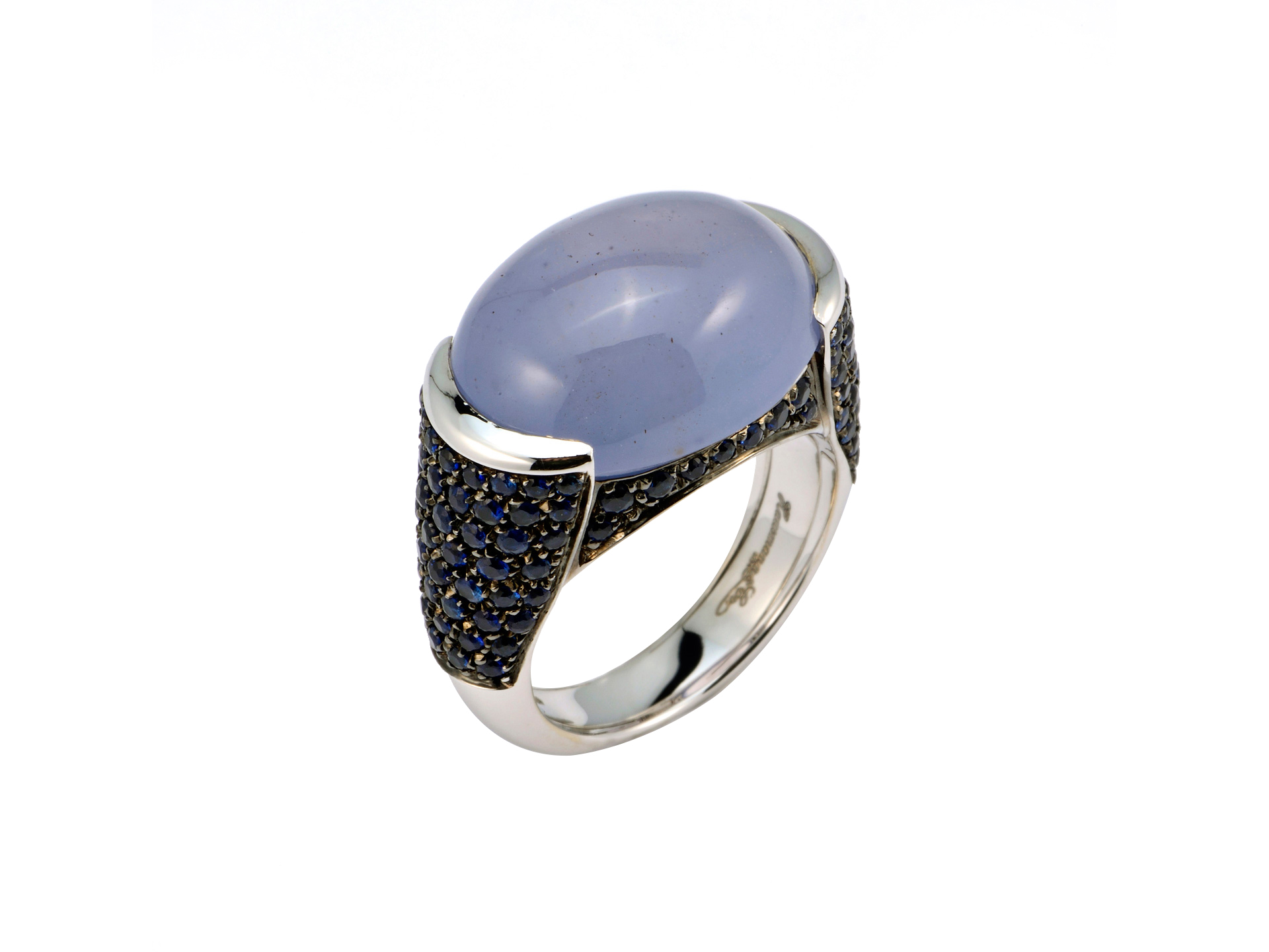 Ring in white gold with central chalcedony ( ct. 8.55 ) and blue sapphire ( ct. 1.23 ) from Hausmann & Co. Cinque Terre Collection. Hand made in Italy.