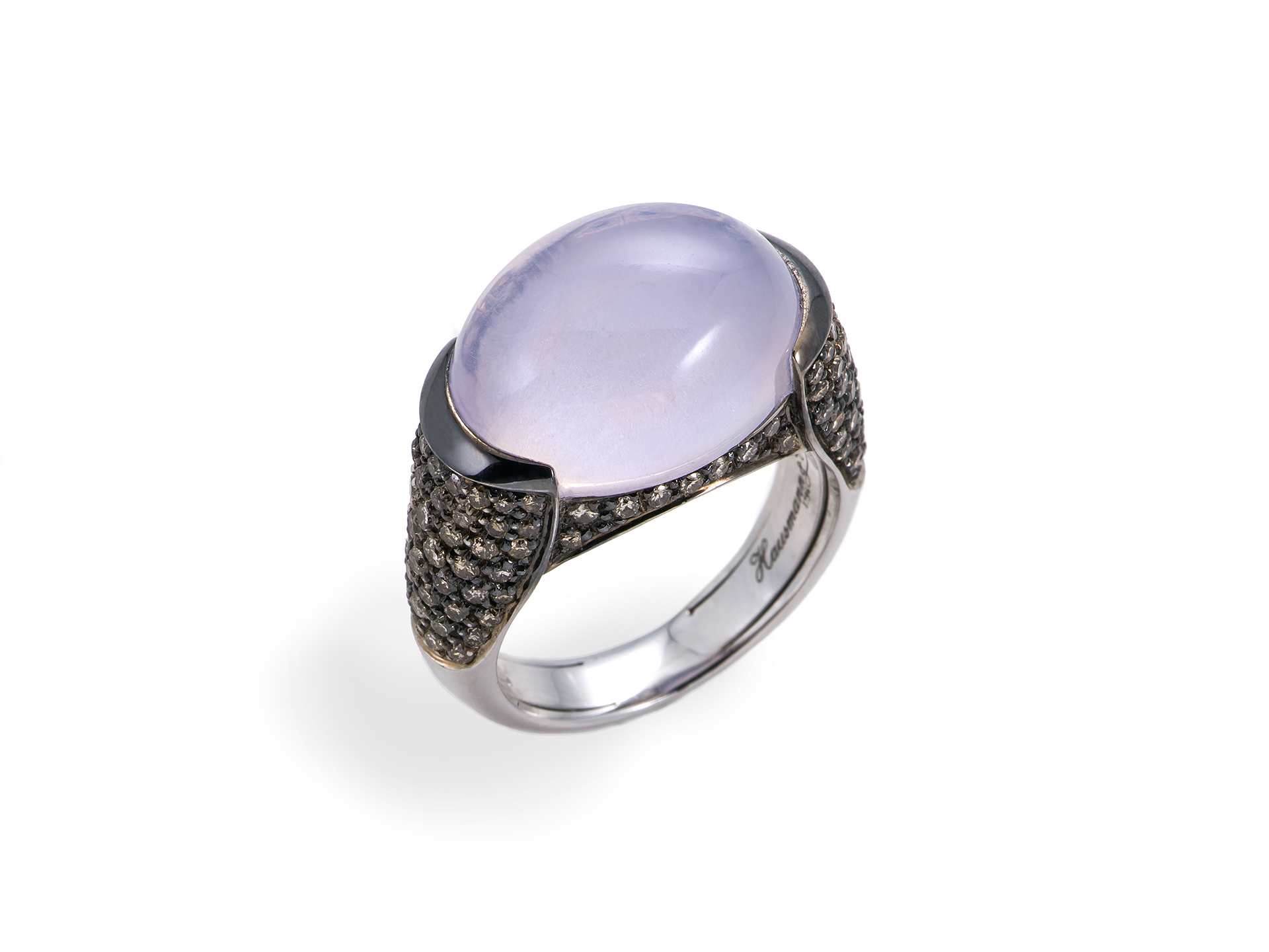 Ring in white gold with central milky amethyst cabochon ( ct. 10.50 ) and brown diamond ( ct. 1.09 ) from Hausmann & Co. Cinque Terre Collection. Hand made in Italy.