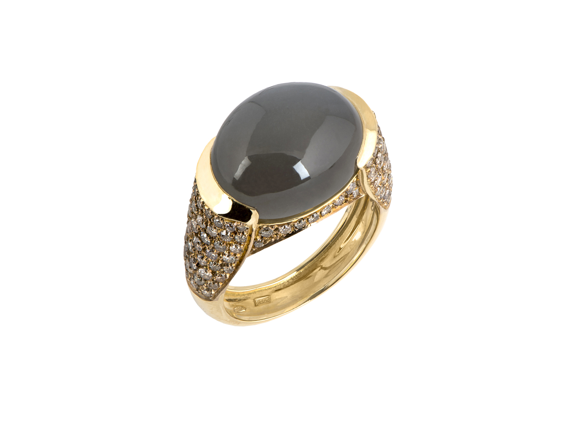 Ring in yellow gold with central moon stone cabochon ( ct. 9.70) and brown diamond ( ct. 1.10 ) from Hausmann & Co. Cinque Terre Collection. Hand made in Italy.
