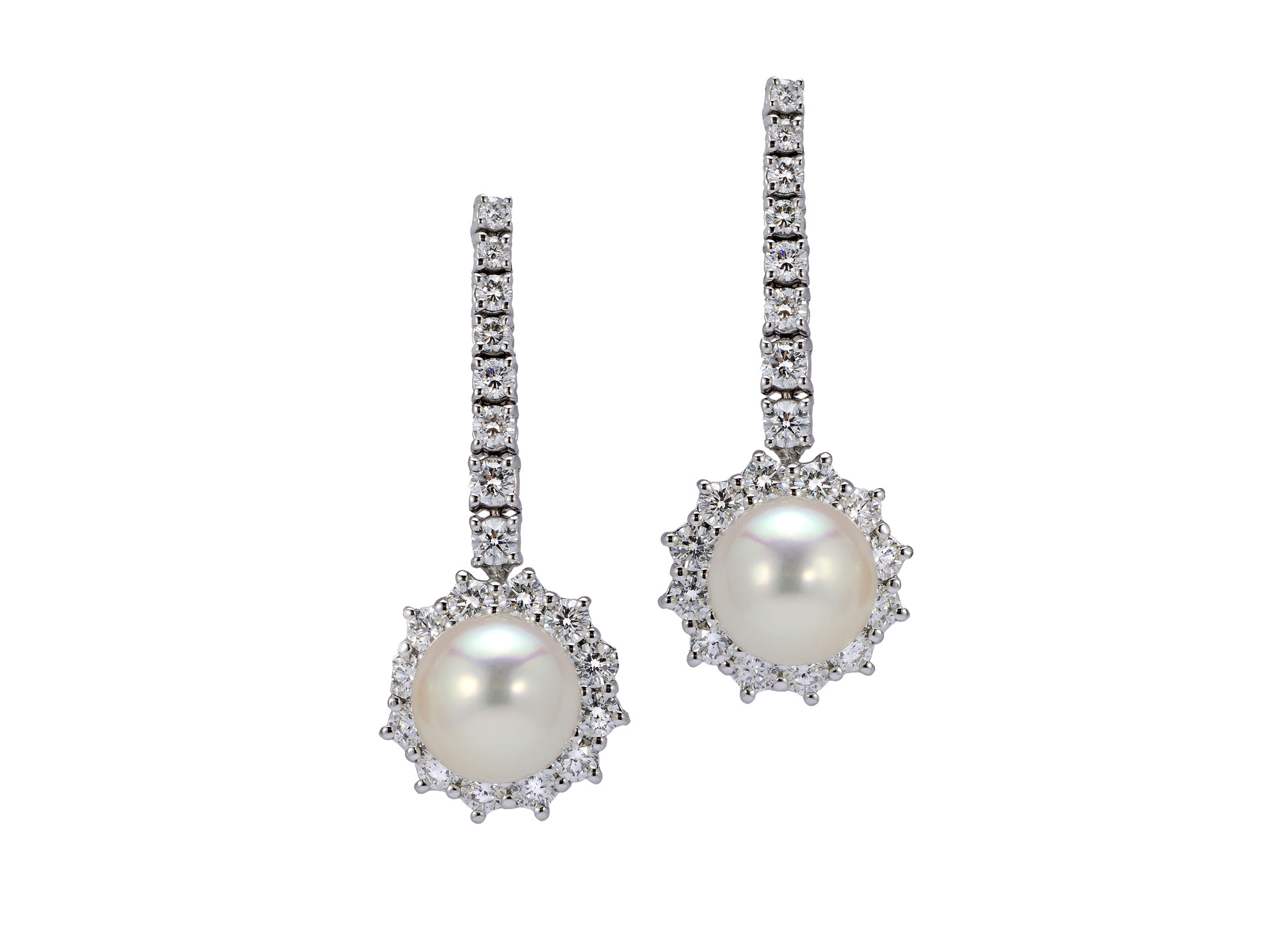 “Daisy” model. Earrings in white gold with central white Japanese pearl (diameter 9.5 mm each) and round brilliant cut diamonds (ct. 2.40). Set with "Daisy" pearl and diamond ring available. Hand made in Italy.