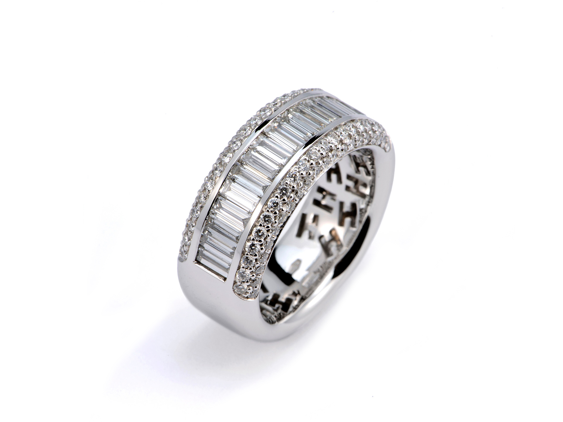 Anello "Boulevard" in oro bianco con diamanti taglio baguette (ct. 1.35) e taglio brillante (ct. 0.60).