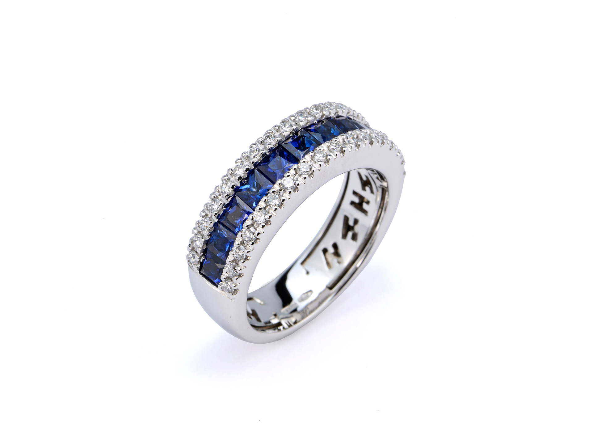 Anello a fascia "Boulevard" a mezzo giro in oro bianco con zaffiri taglio princess (ct.1.77) e diamanti taglio brillante (ct.0.40).