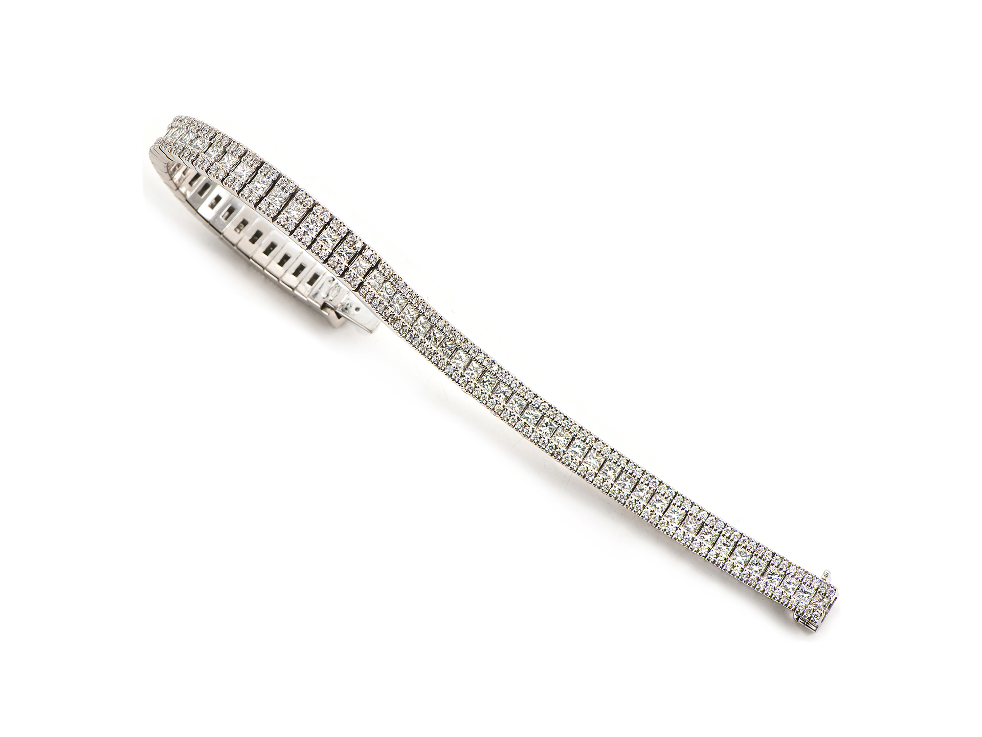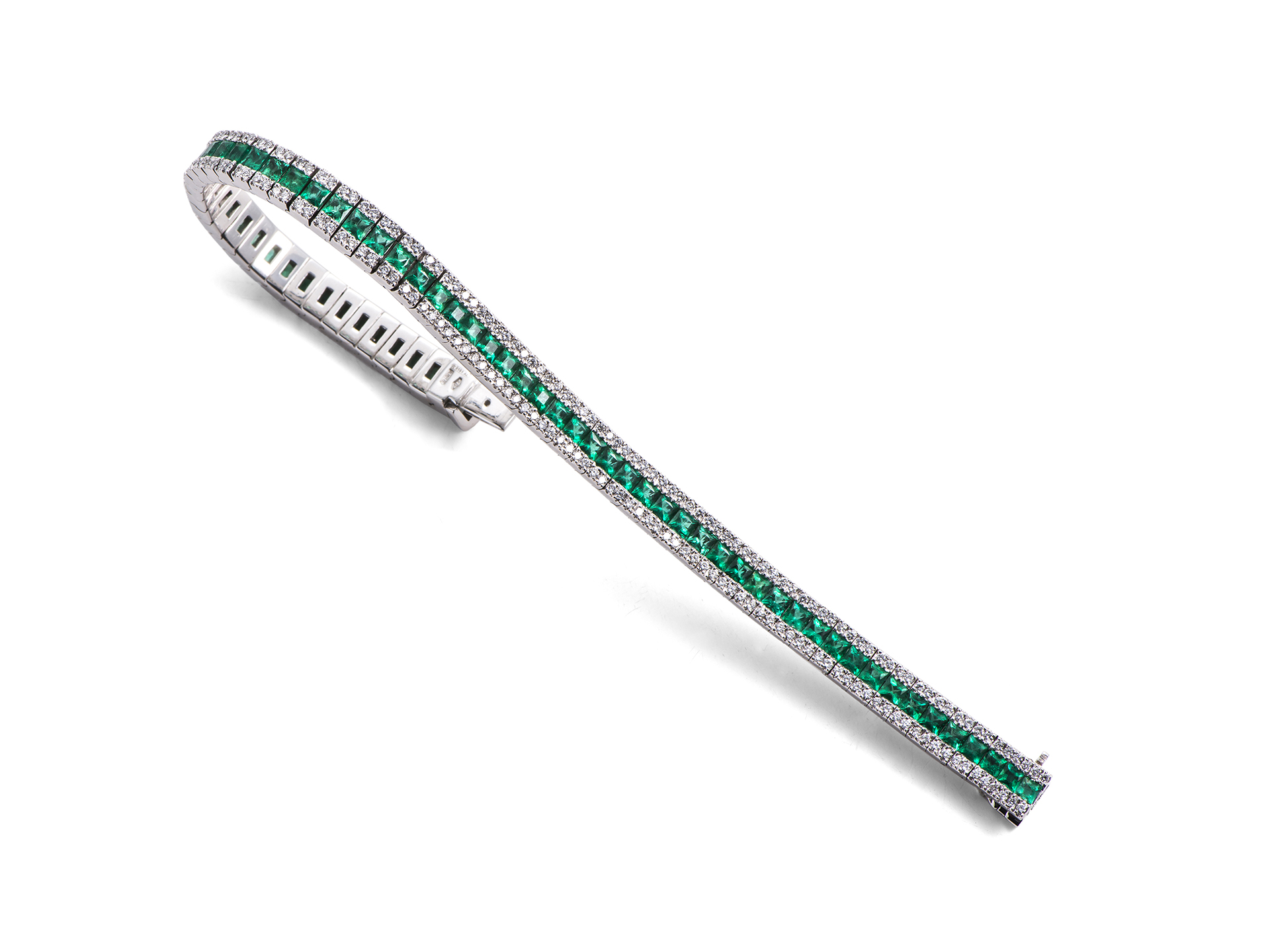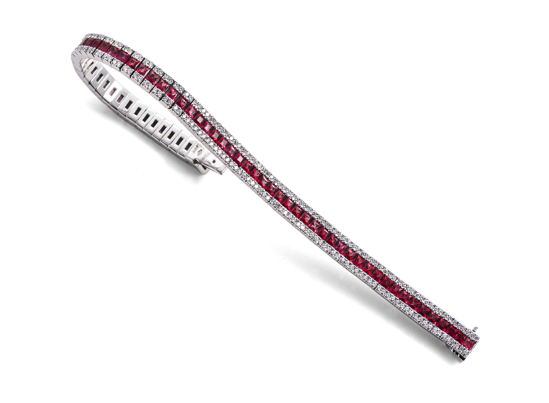 Orecchini "Boulevard" in oro bianco con rubini taglio princess (ct. 2.46) e diamanti taglio brillante (ct.0.55).