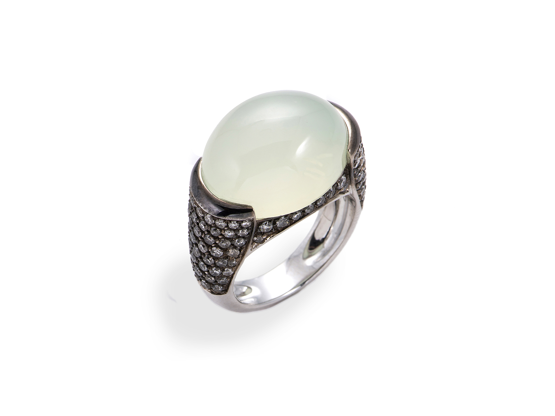 Anello in oro bianco con cabochon centrale di calcedonio verde (ct. 10.55) e diamanti grigi (ct. 1.05). Collezione Cinque Terre.