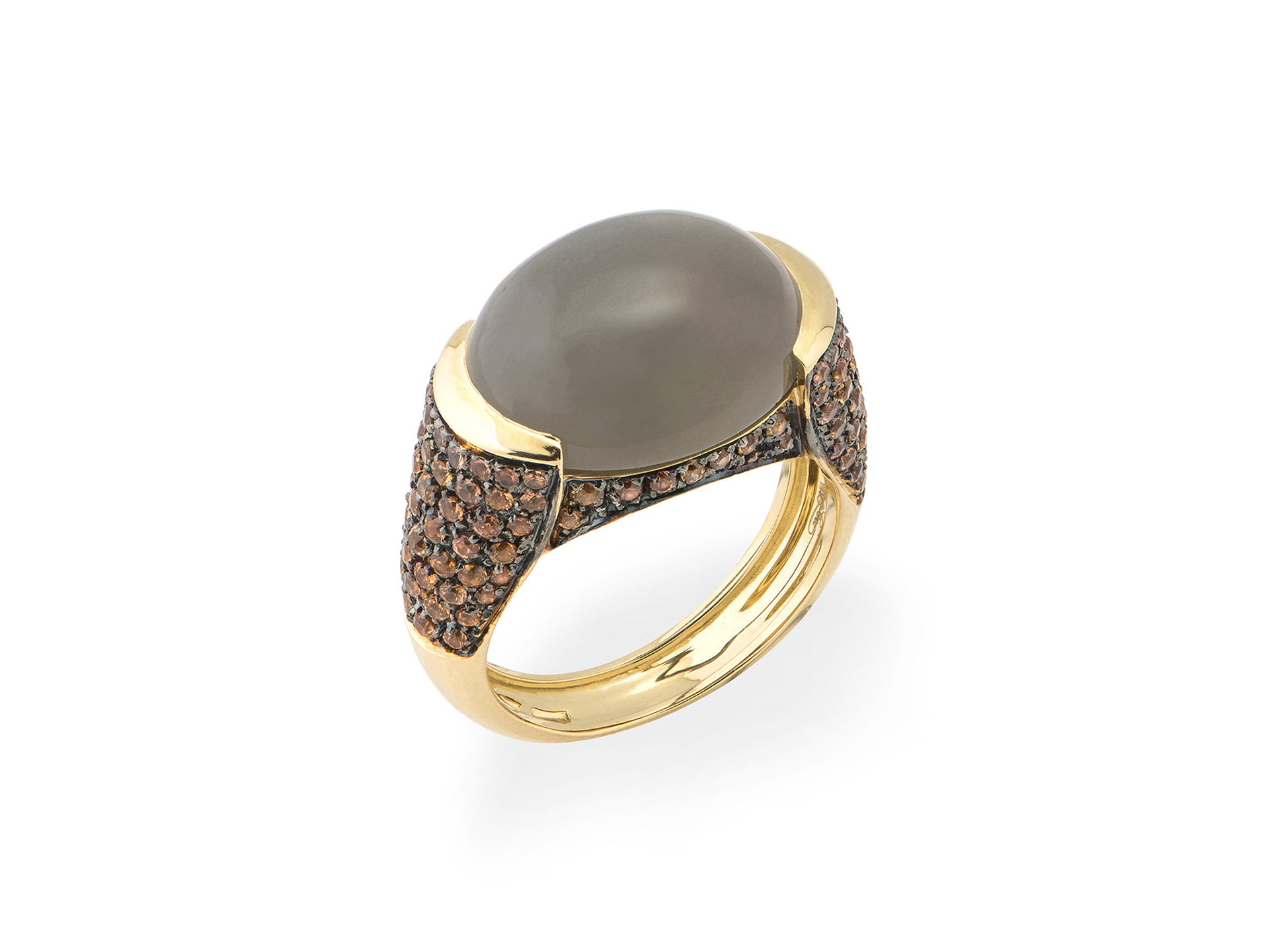 Anello in oro giallo con cabochon centrale di pietra di luna (ct. 8.80) e pavé laterale di zaffiri arancio (ct. 1.31)