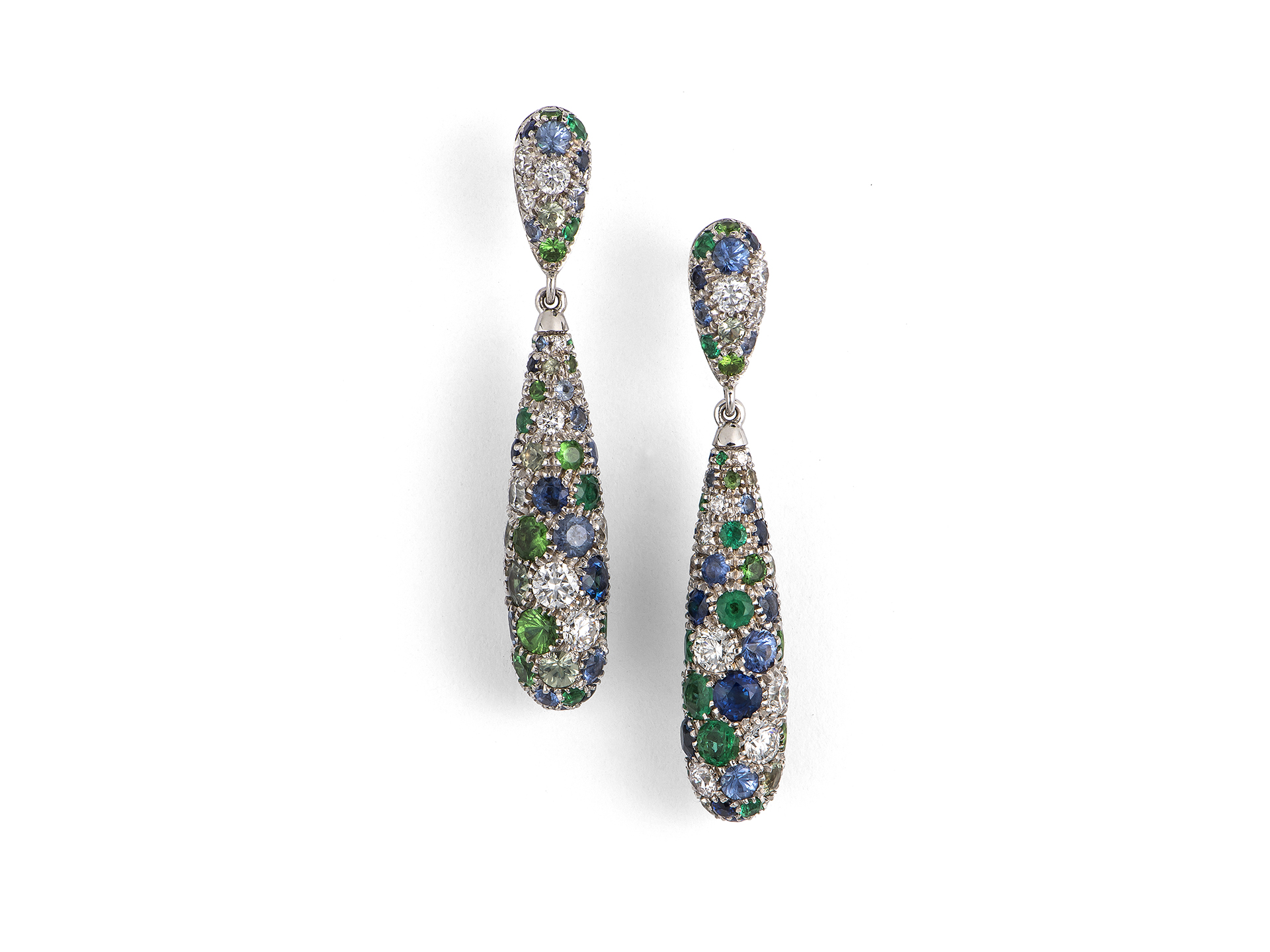 Orecchini a goccia con diamanti, zaffiri e smeraldi sui toni freddi