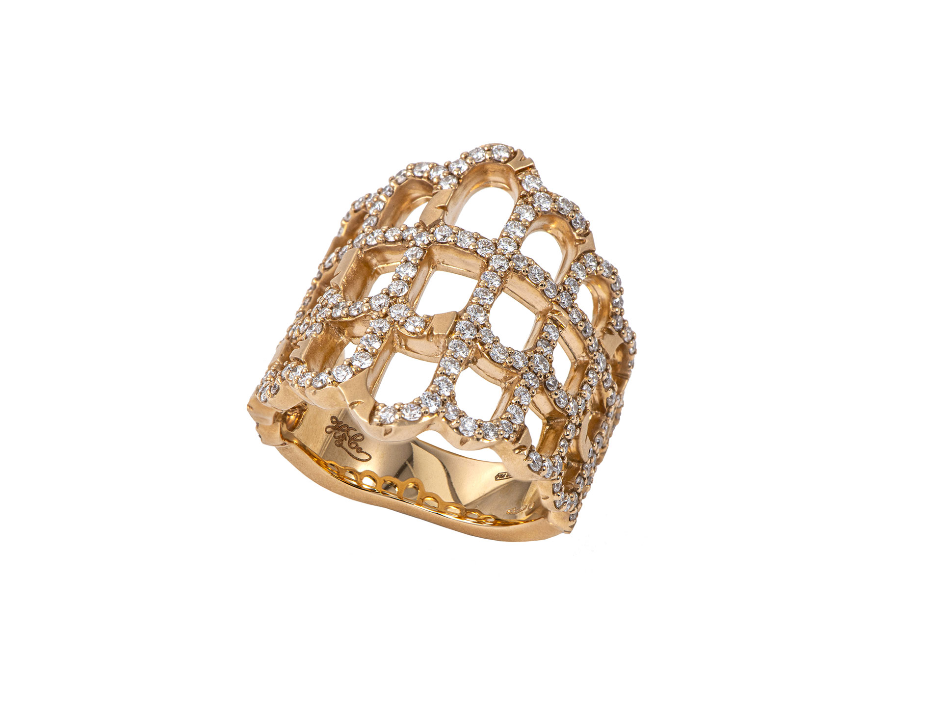 Anello in oro giallo e diamanti, a tre arcate, ispirato agli acquedotti romani, disponibile nei tre colori dell'oro. Disponibile parure con collana, bracciale e orecchini.