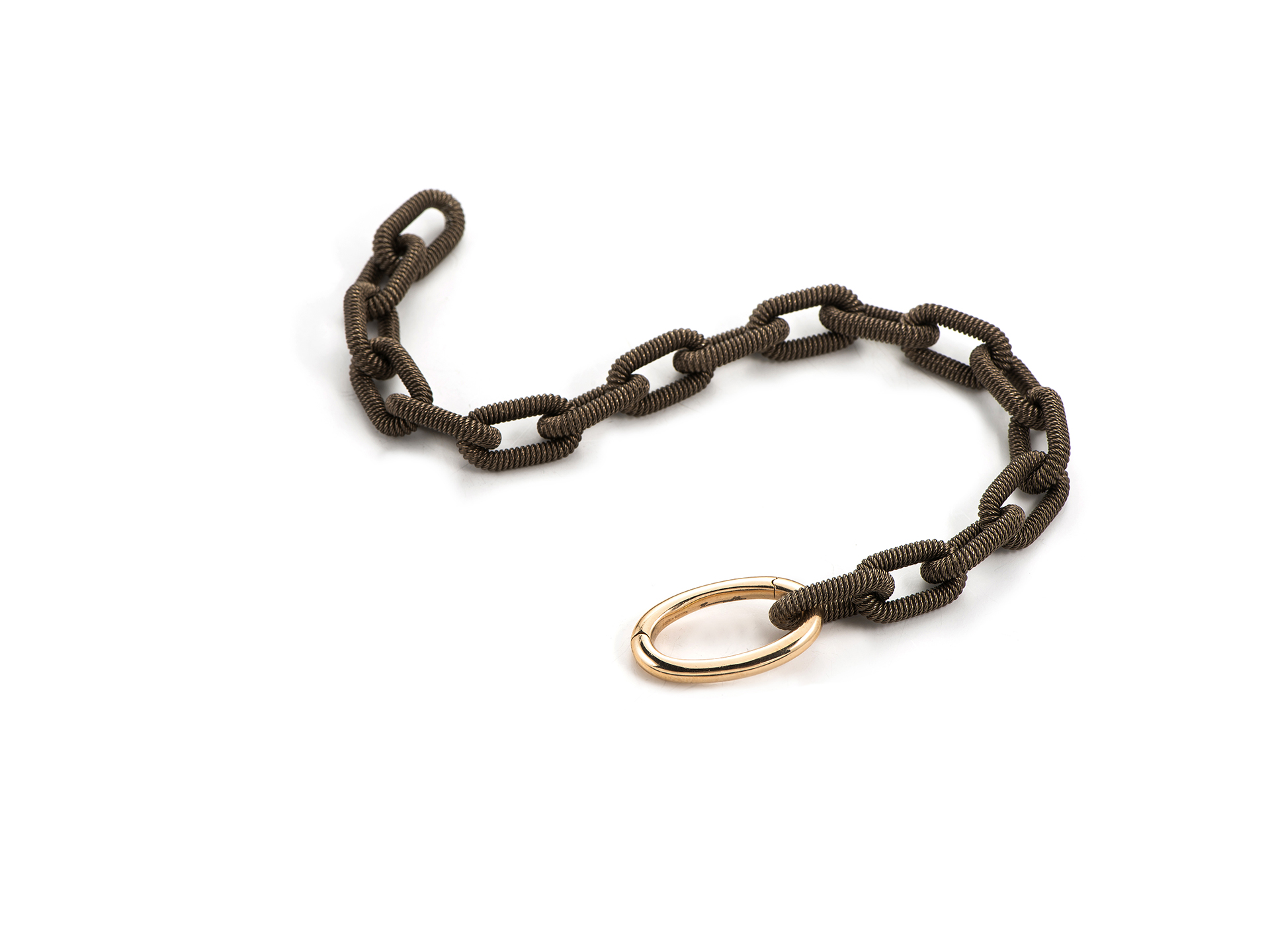 Bracciale a catena in argento con trattamento in PDV marrone, fotografato con chiusura ovale in oro rosa. Le chiusure sono intercambiabili e disponibili in diverse versioni.