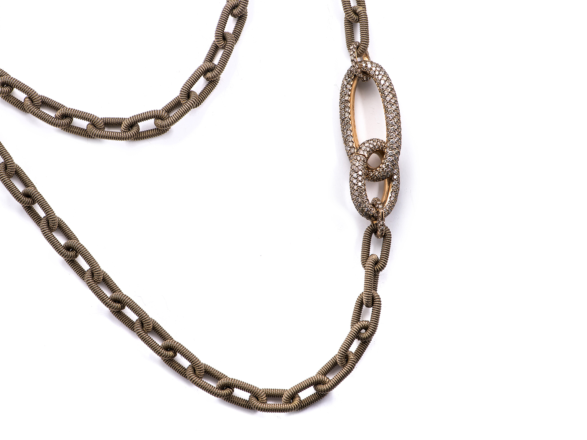 Collana a catena in argento con trattamento in pvd marrone, fotografata con un set di quattro chiusure ovali di diversa grandezza in oro rosa e diamanti brown. Le chiusure sono intercambiabili e disponibili in diverse versioni.