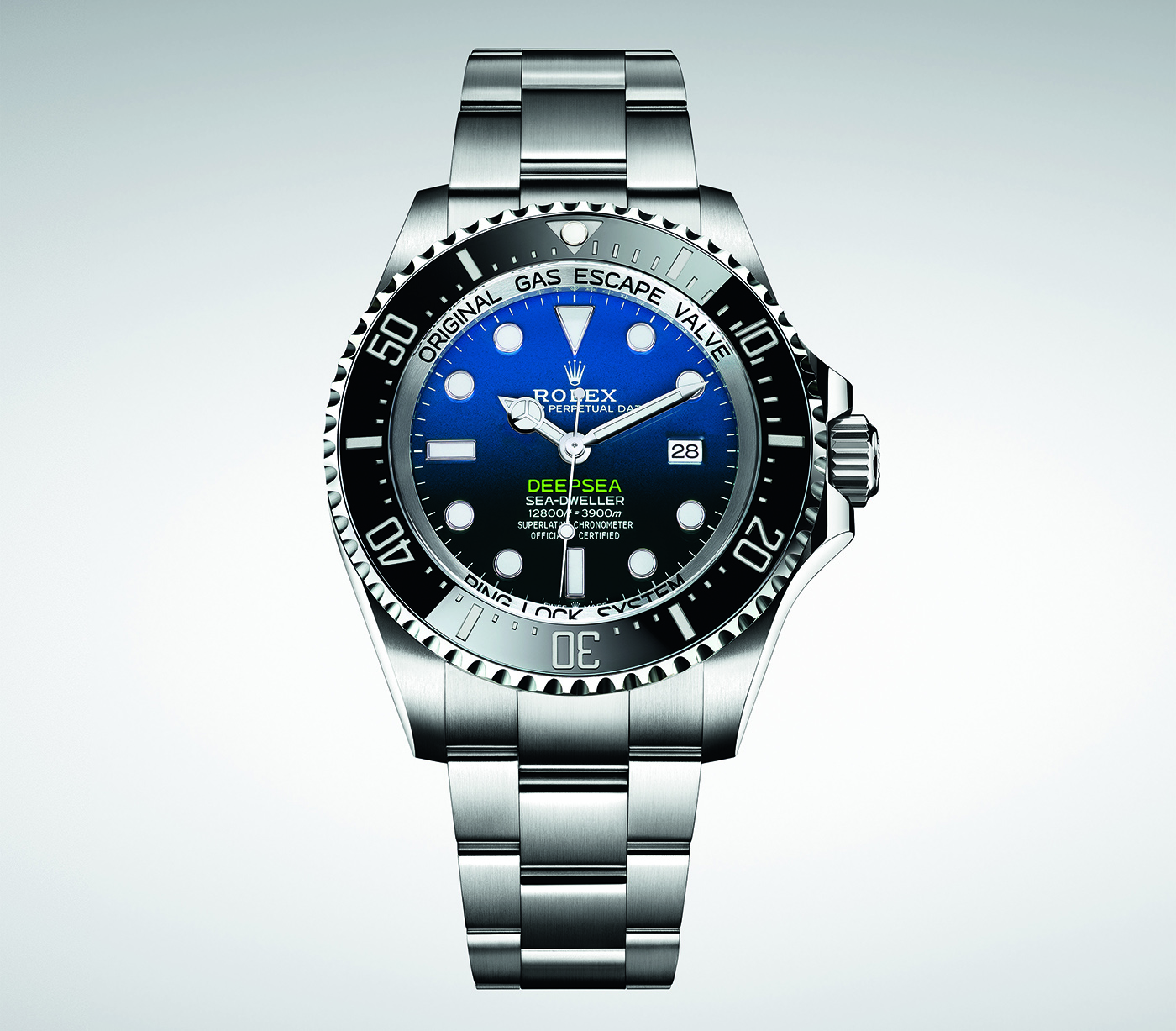 Il nuovo Rolex Deepsea è in grado di resistere alla pressione esercitata dall’acqua a grandi profondità grazie a due caratteristiche. In primo luogo, il fondello in titanio ha una flessibilità quasi impercettibile ma estremamente efficace, che lo rende estremamente resistente. In secondo luogo, il Ringlock System permette al vetro del Rolex Deepsea di resistere a una pressione equivalente a un carico di tre tonnellate. I tre componenti essenziali della cassa, realizzati in materiali di concezione aerospaziale tra i più resistenti, sono sigillati ermeticamente dalla pressione dell’acqua: a mano a mano che la profondità aumenta, i tre componenti, incluso il fondello, vengono spinti sempre di più uno contro l’altro.