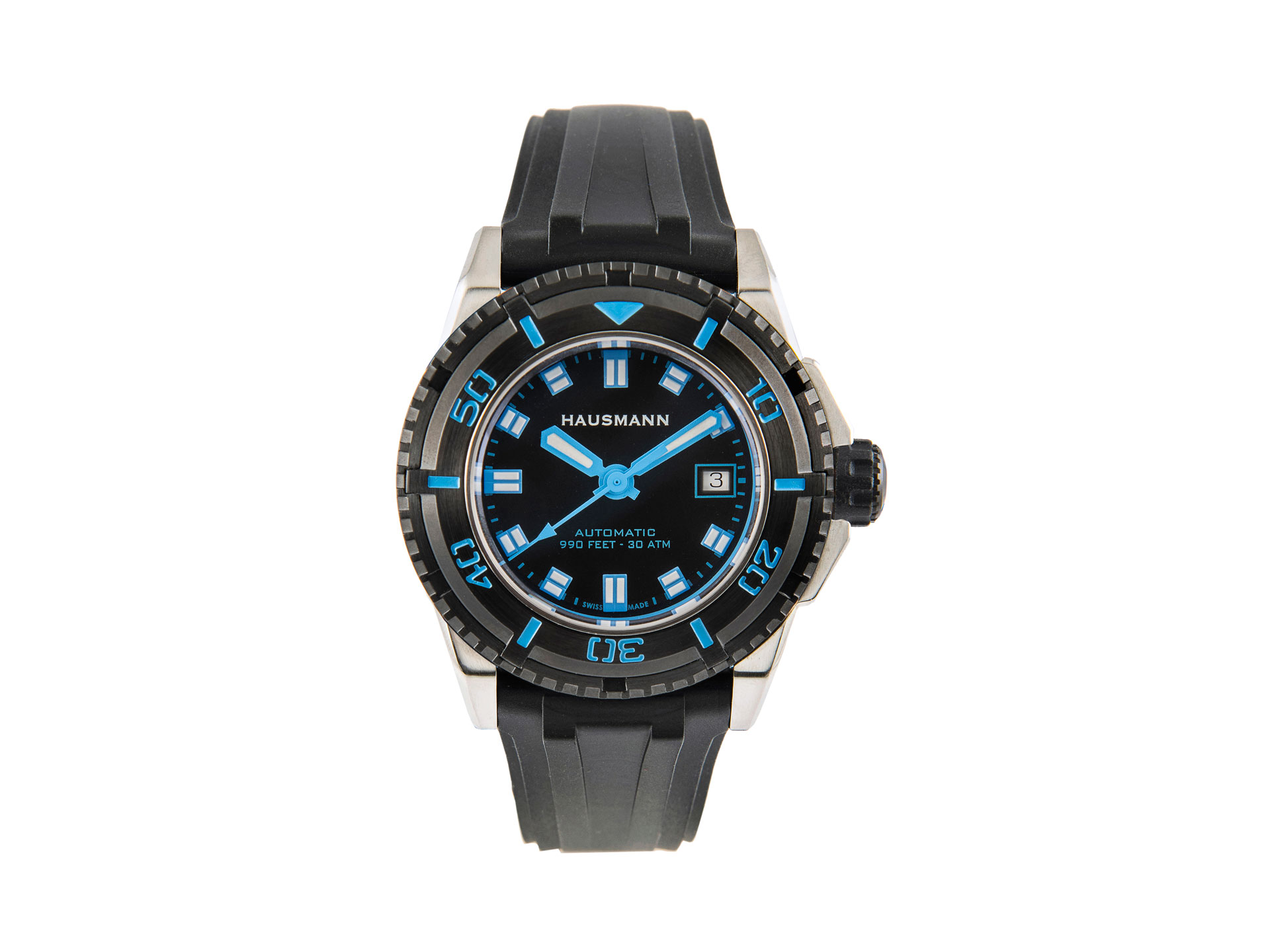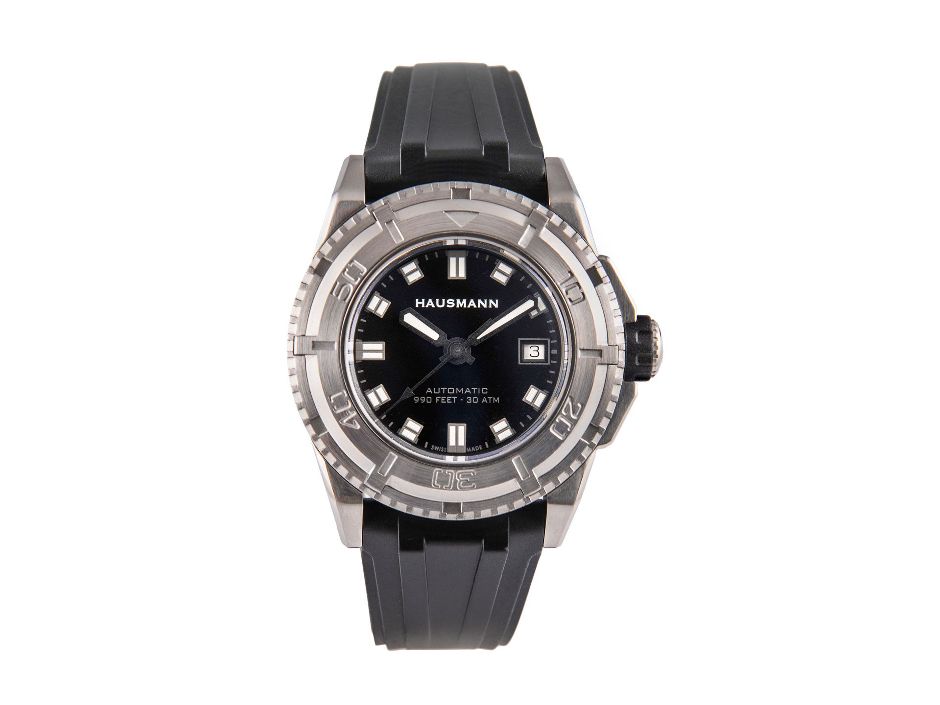 Orologio subacqueo Hausmann & Co. in acciaio, con quadrante avorio cassa e lunetta girevole nero opaco, numeri incisi tono su tono.