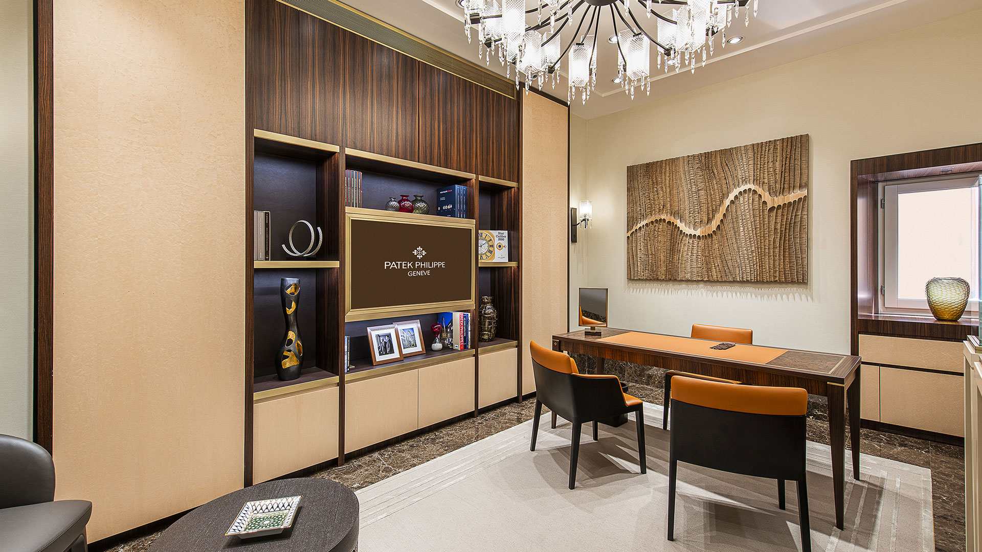 Un’opera unica, creata appositamente per la Boutique Patek Philippe Hausmann & Co. di Roma: un quadro che rappresenta il corso del Tevere, il fiume simbolo che ha segnato la storia della Città, accoglie il visitatore nell’elegante salottino privato della Boutique, aperta nel 2020, che offre una vista esclusiva sulla prestigiosa via dei Condotti.