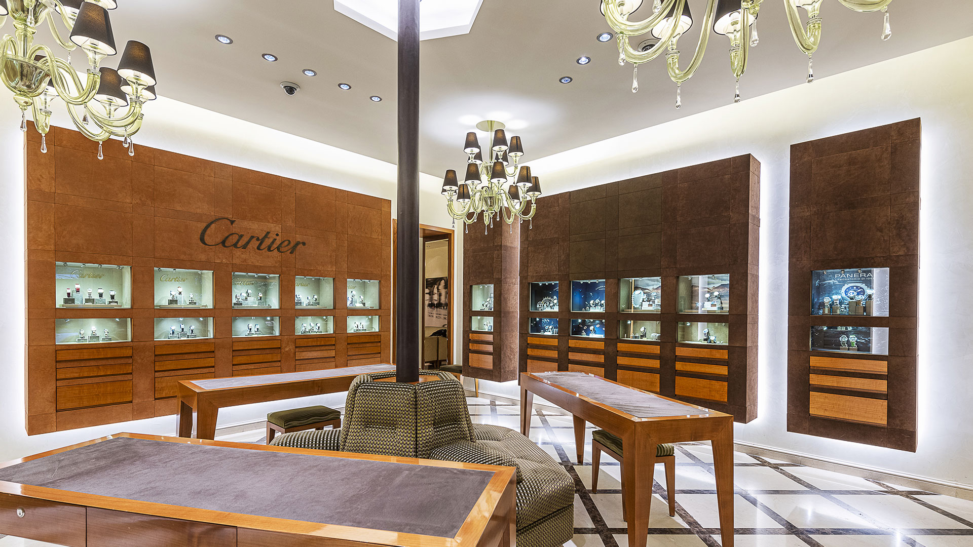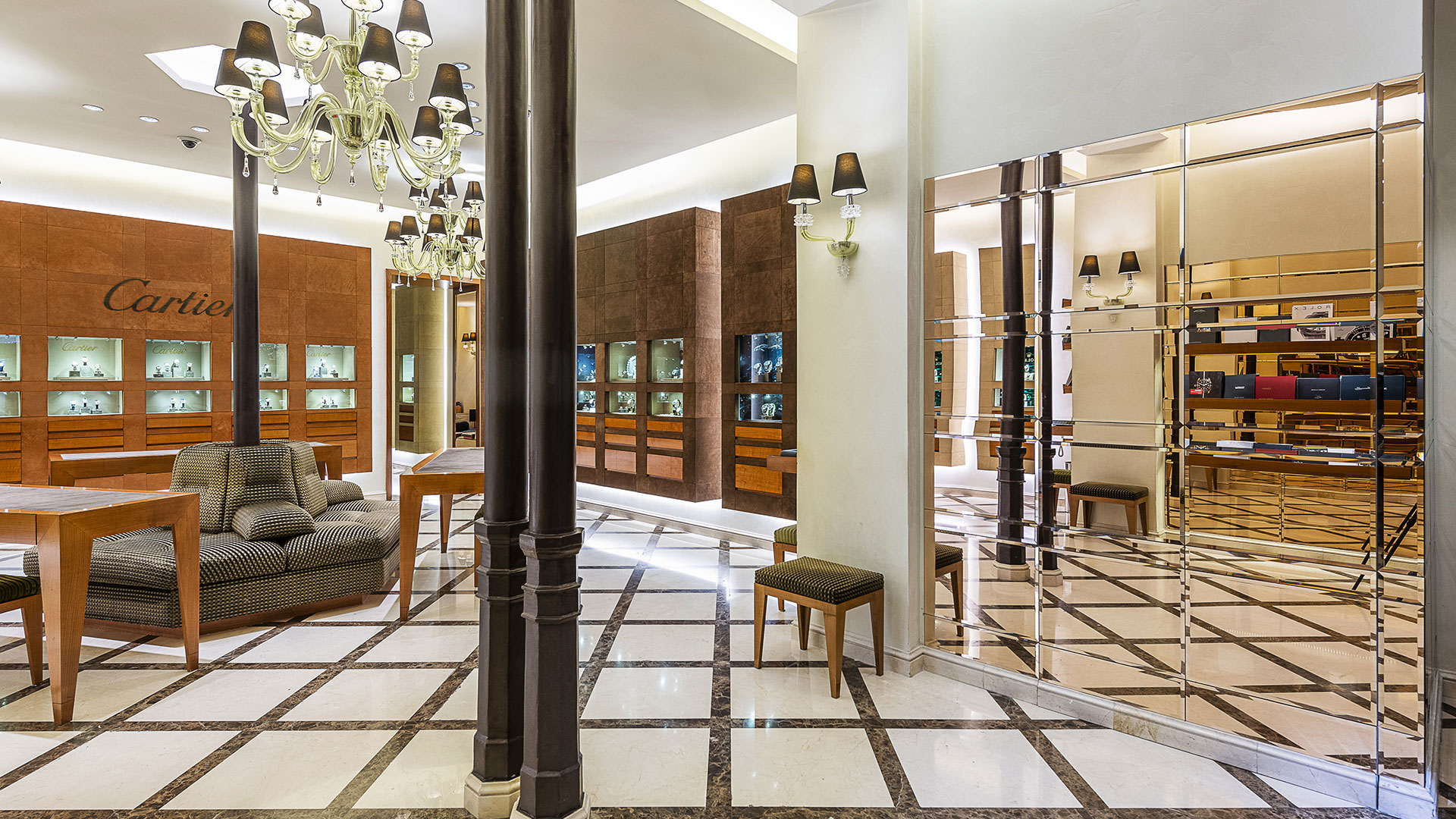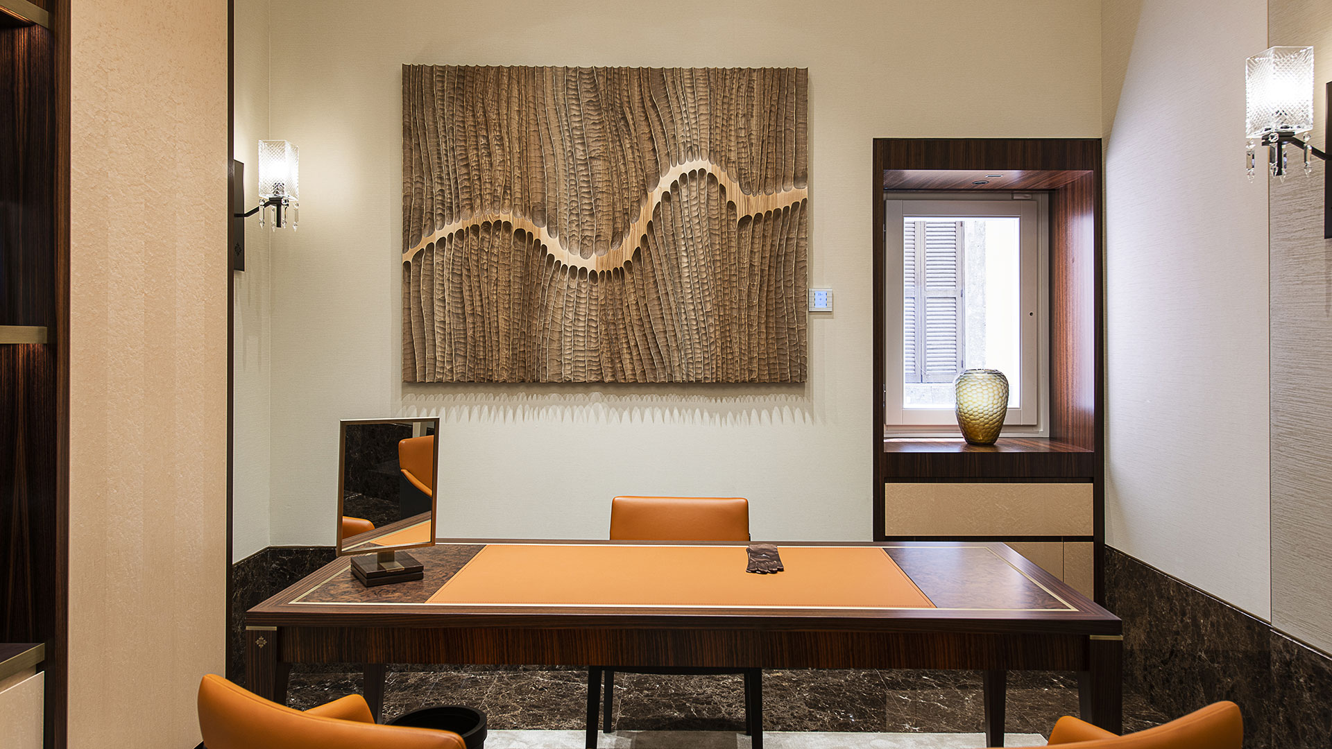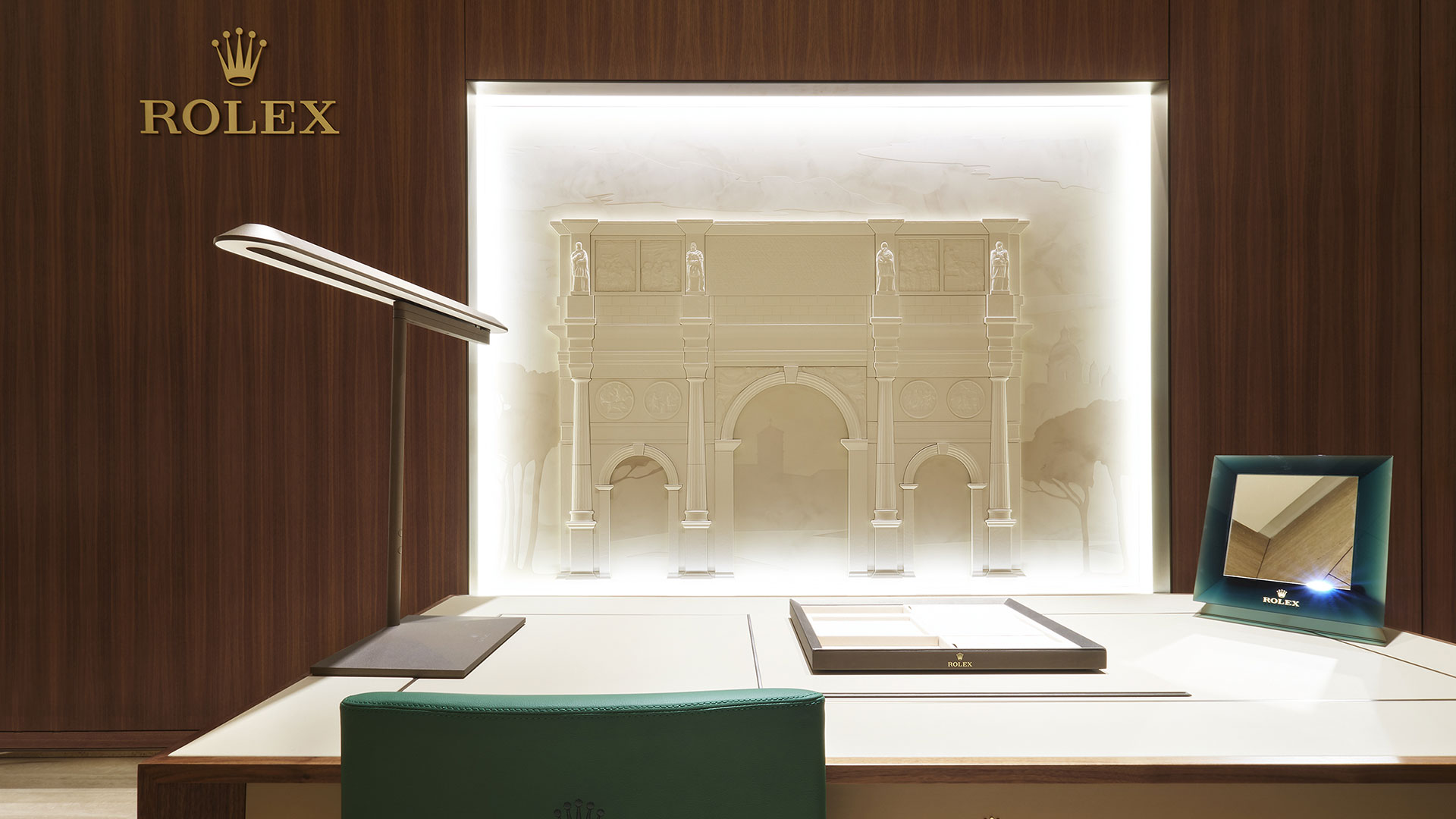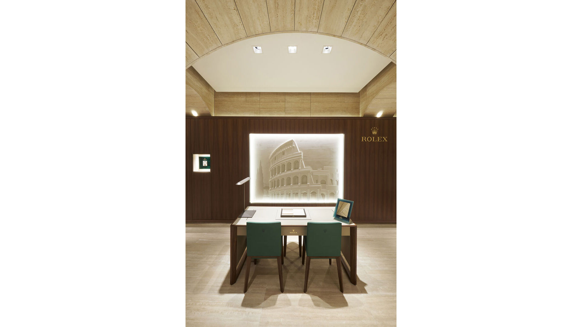 I muri in noce e travertino della Boutique Rolex Hausmann & Co., inaugurata nel 2019, ospitano pannelli che alternano elementi in stucco ad altri in pelle raffiguranti vari monumenti della Città. Il Colosseo, la Fontana di Trevi e ancora la Fontana dell’Acqua Paola, nota anche come Fontanone del Gianicolo, accompagnano il visitatore nel suo viaggio alla scoperta della Grande Bellezza romana, all’interno della Boutique stessa.