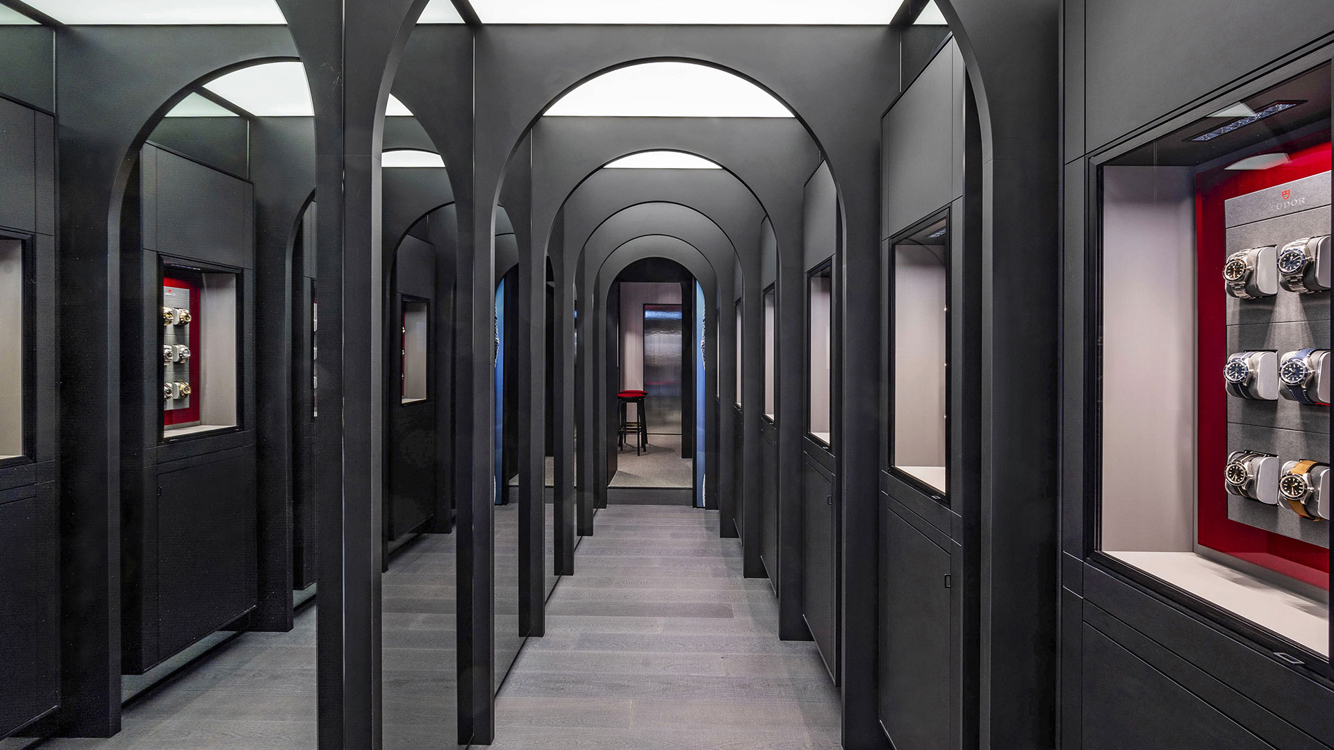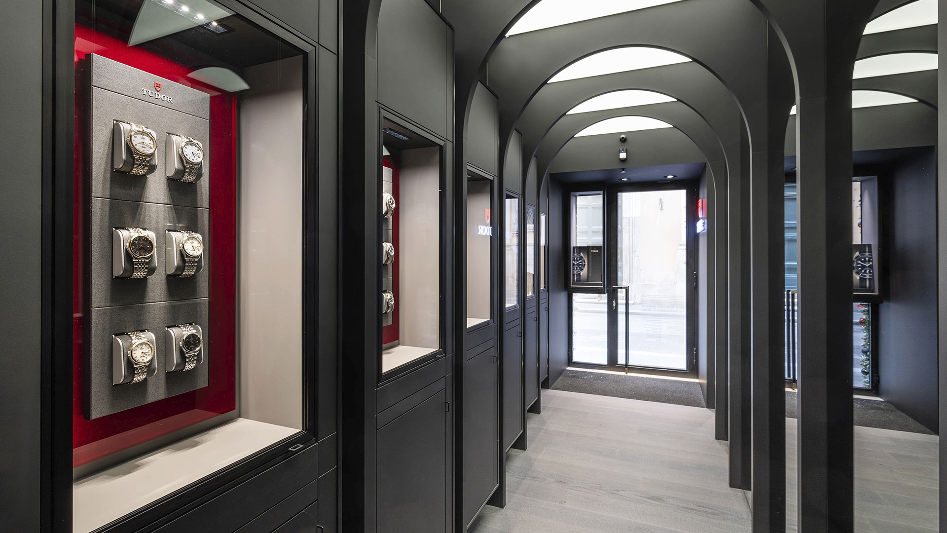 Innumerevoli archi e un bellissimo gioco di trompe-l’œil: l’omaggio all’architettura e all’arte di Roma all’interno della Boutique Tudor Hausmann & Co. conducono il visitatore in un viaggio simbolico nella storia dell’architettura della Città.